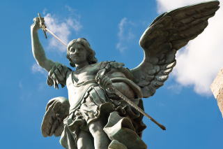 a2.大天使ミカエルはユダヤ教ではイスラエルの守護天使。キリスト教では天界の司令官として描かれます。大天使ミカエル像は悪魔または悪人を踏みつけ右手に剣をもってとどめを刺そうしているイメージです。左手には生前の行いを計る秤をもっているのが基本ですが剣の鞘をもっている場合もあります。