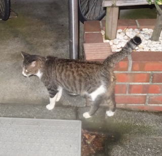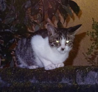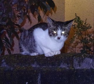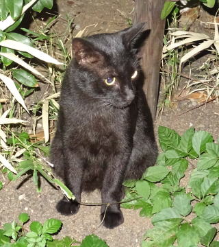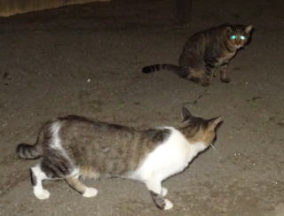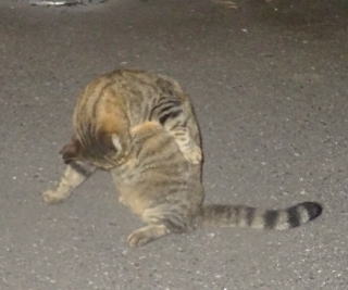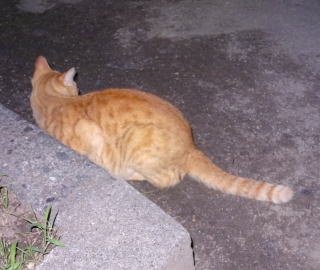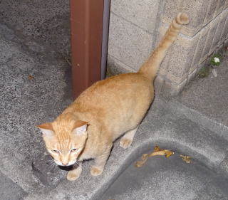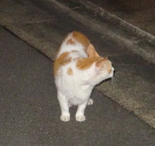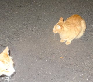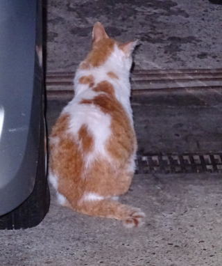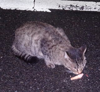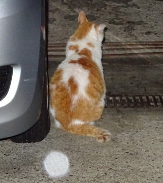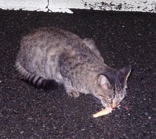 38.パパの自宅の敷地内に住んで野良となったアン王女が可哀相なので焼き鰹をあげた。子猫が捕まれば一緒に保護しても良いのに…子猫は素早く逃げてしまう。