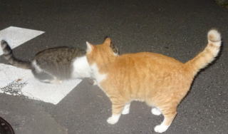 22.地域の雌のボス猫の茶子ちゃんの女の順位は一番です。クリスちゃんをはじめとするネコちゃん達はひれ伏していますね。