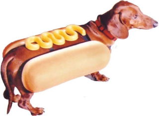 この画像は脇役32のa6です。ダックスフンド(ドック)種に細長いパンの着ぐるみを着せるのは楽しみです。