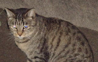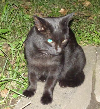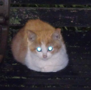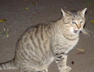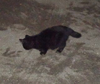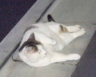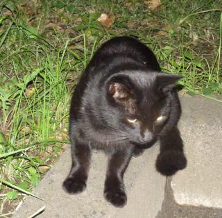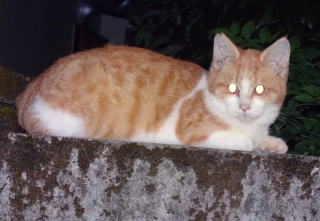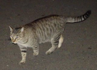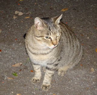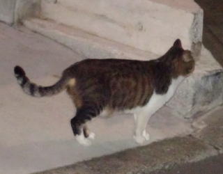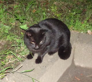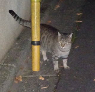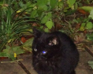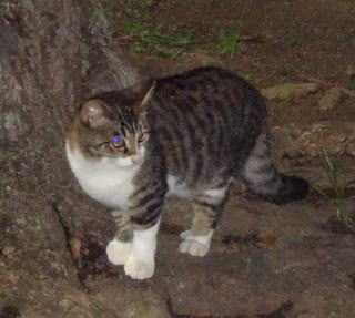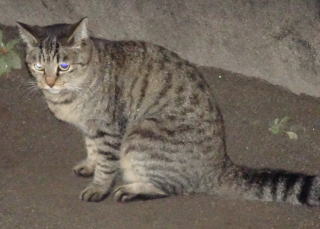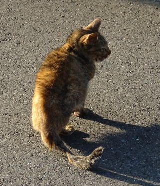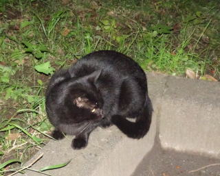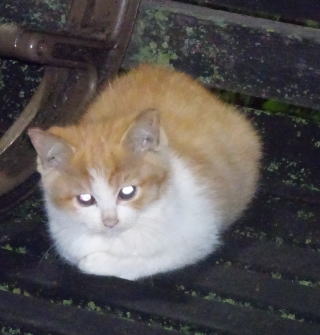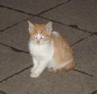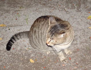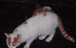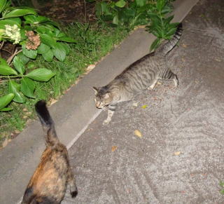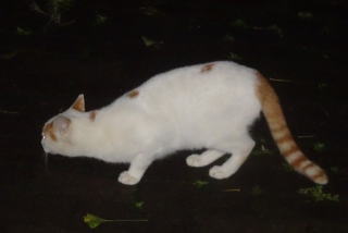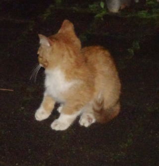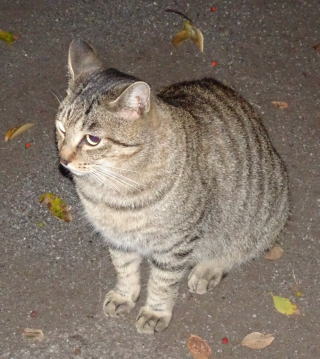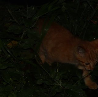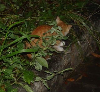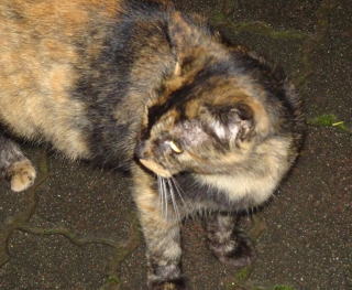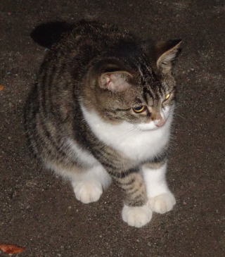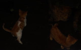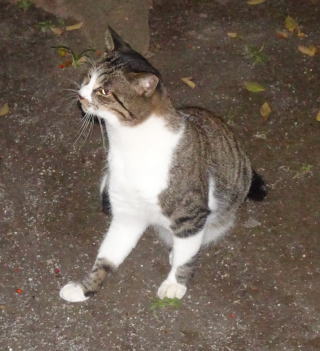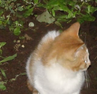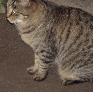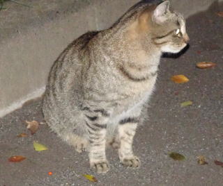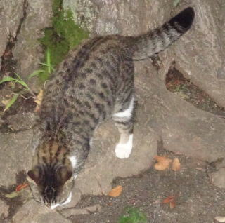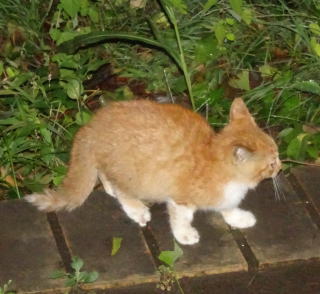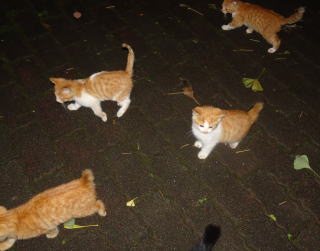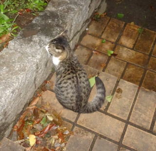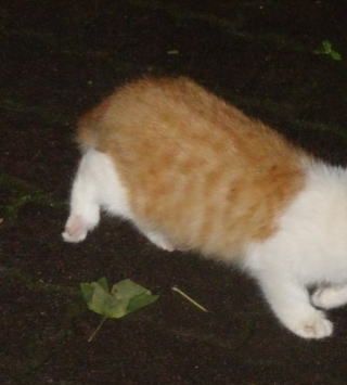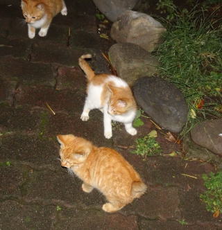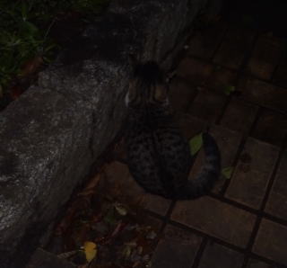 1.パパの前に普段は絶対に人前には出ない五匹の生後二か月位の子猫と同伴する白茶の成猫の雌が出現しました。これは一匹目の子猫です。パパは10月に生後二か月位の子猫?と言う事はこの子猫達は夏生まれ(8~9月)なのか?と驚きました。