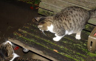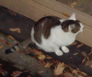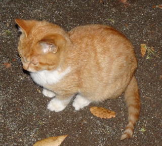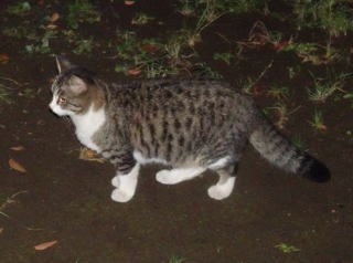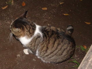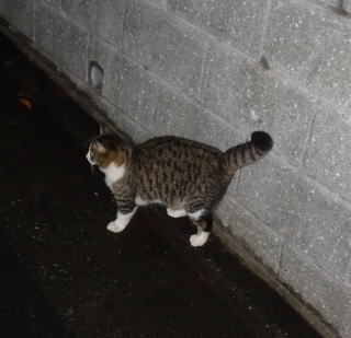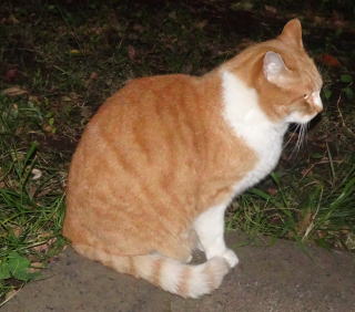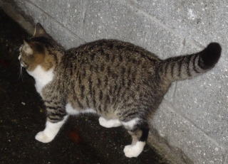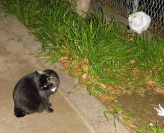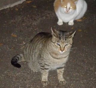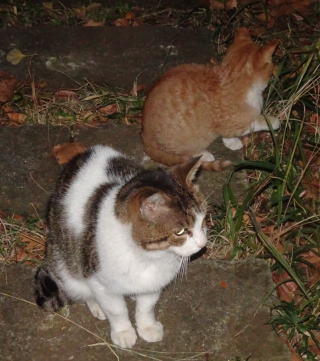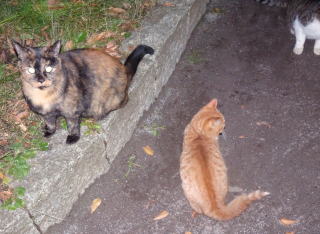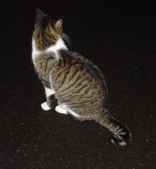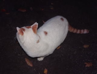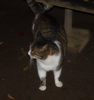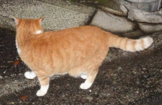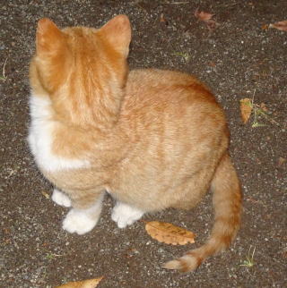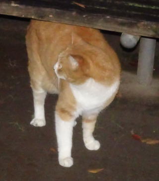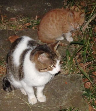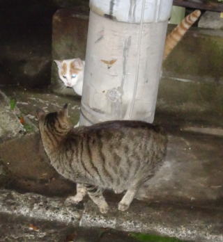 この画像は九郎ちゃん36の23です。発情期に白三毛子ちゃんに求愛したのですが「顔に土が付いているよ。顔を洗って出直してきてよ」と失笑した雌猫です。