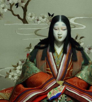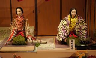 b2.現代人から見ると正に九尾狐の化身である玉藻前の姿となる為、この藤原得子ちゃんの菊人形は現代人の好みに合わせ眉毛は剃らず一重瞼のアーモンド目のキツネ目でお歯黒の代わりに口紅をしています。かつ能面の様に無表情ではなく微笑んでいます。