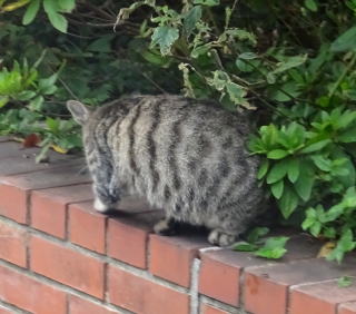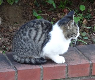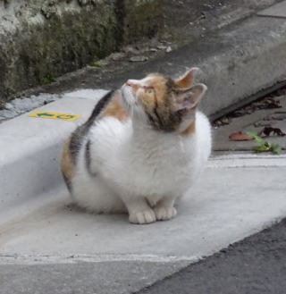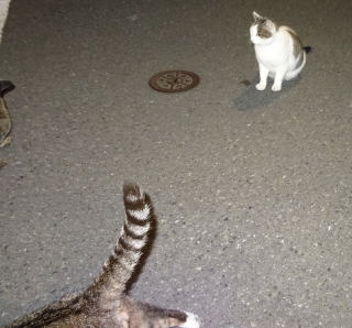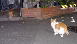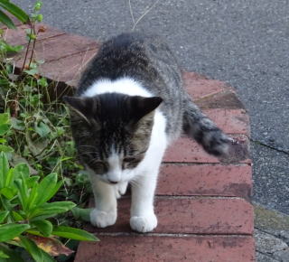 3.パパが泥棒猫の分身の様な白三毛の子猫の相手をしていると泥棒猫が心配になって民家の塀の上を歩いて近寄って来ました。子猫がもう少し小さい時は泥棒猫はパパを「ハァ」と威嚇していました。
