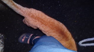 14.ハンナちゃんの様に巨大で胴長なチャトランちゃんがパパの足をマーキングしています。