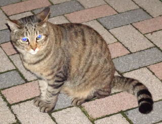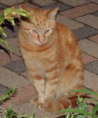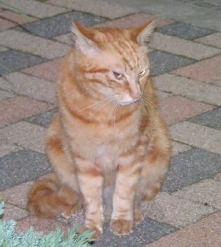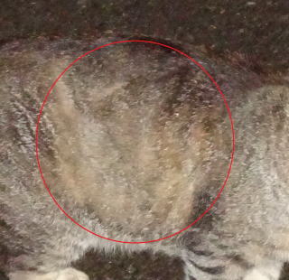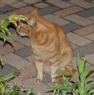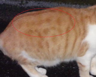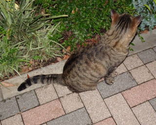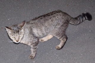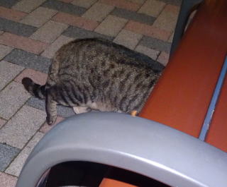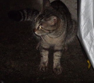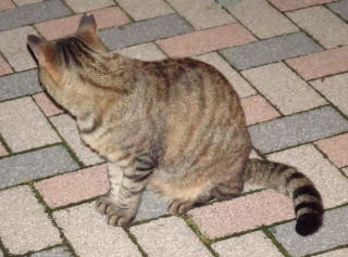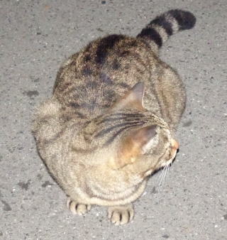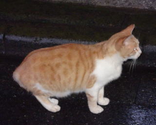 上記のアップ。これは目の錯覚でした。クラシック・タビー柄固有の背から尾にかけての直線がありません。