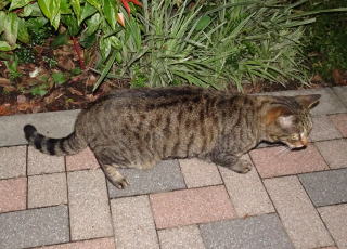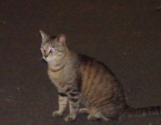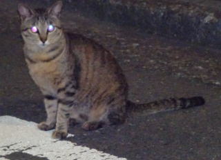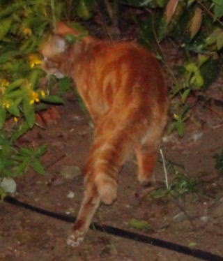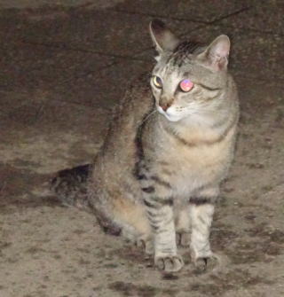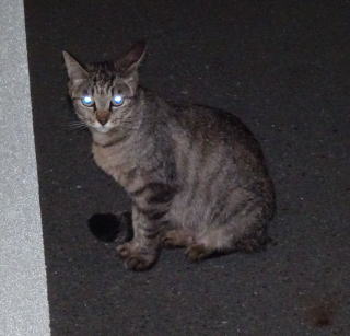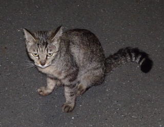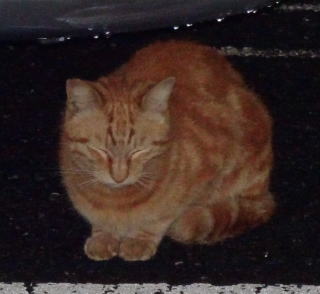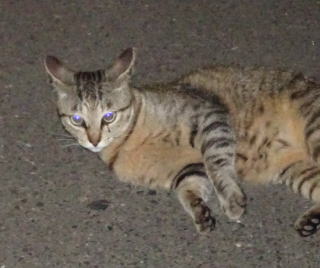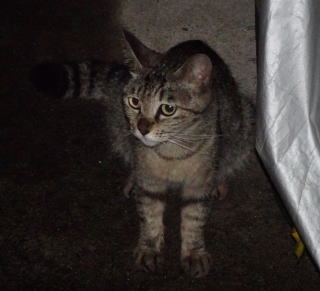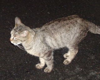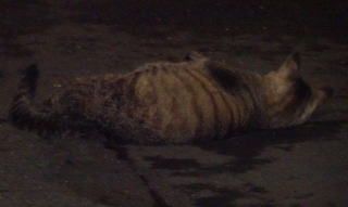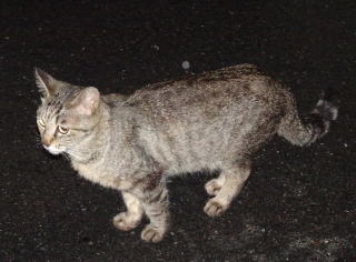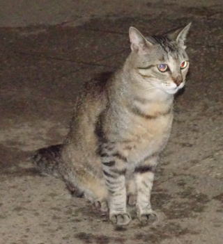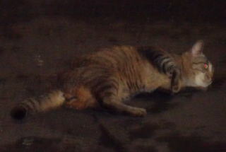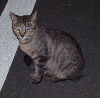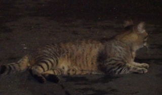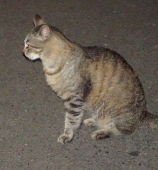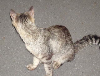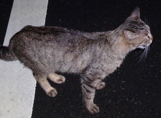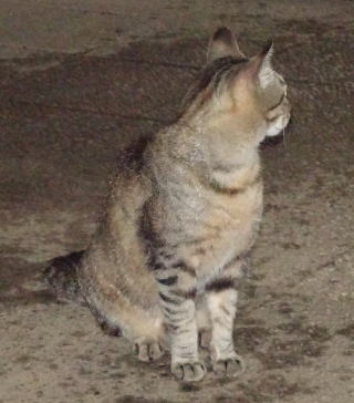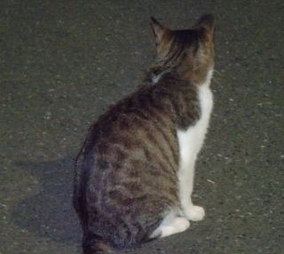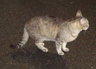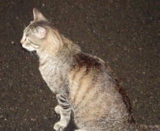 上記のアップ。虎柄の日本猫とクラシック・タビー柄のネコちゃんが混血したのでしょう。背から尾にかけての直線があります。ドンナ杏奈ちゃんはただのキジ虎柄だったのです。