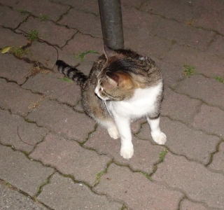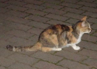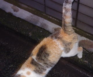 16.薄い色の三毛猫のパパの自宅のゴミをあさろうとしているのでしょうか?。