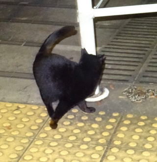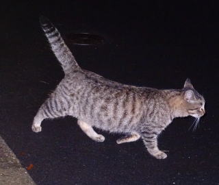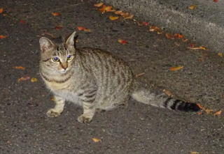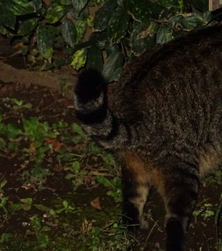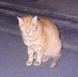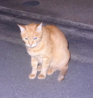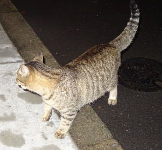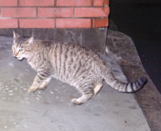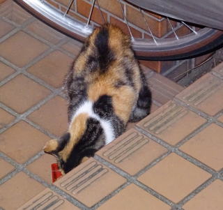 1.この三毛猫の子猫はこの借家人の玄関先でキャット・フードをもらって食べています。初めて見る子猫だ。母親は誰なのですか?。
