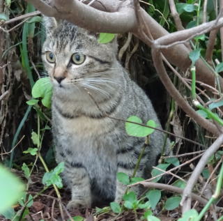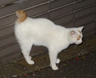 6.この子猫はマルシャリンちゃん・白三毛子ちゃんソックリな子猫です。フミちゃん・マルシャリンちゃん・この子猫と三代に渡る関係なので、容易にナデナデする事が出来ました。そして両手でこの子猫の腹を持ってダッコしようとすると地上10cm位の所で右足でパパの右手の甲を蹴り数cmのキズを付けました。「まぁ良いか」もう少し信頼関係を築いてからダッコする事にします。