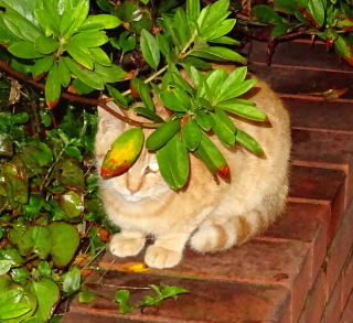 4.この画像はツツジの垣根の下に隠れたアンナちゃんです。「アンナちゃん。怖かったね」。パパがオーナー権限で掃除のおばさんを山田浅右衛門の様に首を切ってやる(実際は解雇)。文句があれば労働基準監察局へ訴えるが良い。受けて立つぞ。