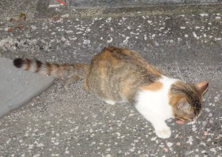 2.前足を前に出して後足を揃えている珍しい寝そべり方だ。