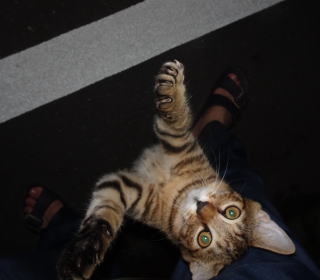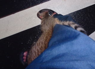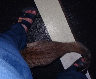 29.アンネちゃんが見上げています。アンネちゃんは「切り裂き女」の様にパパのズボンを爪で引き裂こうと虎視眈々と狙っています。