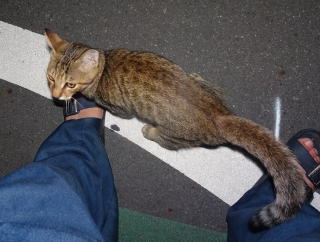 6.子猫のアンネちゃんの方からパパの足をマーキングしています。