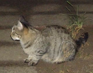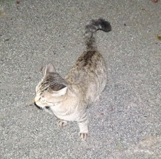 台風12号の雨風の中でネコちゃんの鳴き声で呼び止められました。小太郎ちゃんが雨宿りをしながらパパを待っていました。