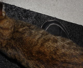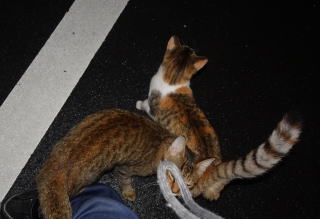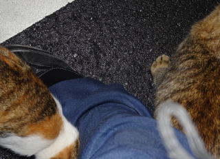 21.キナコちゃんと一緒にパパの足をマーキングするミケーネちゃん。
