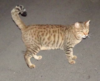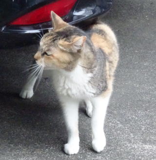 14.三毛珍獣ちゃんがパパの自宅の駐車場の自動車の前でなごんでいます。