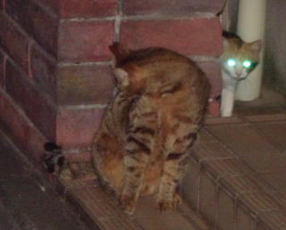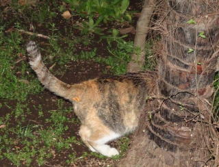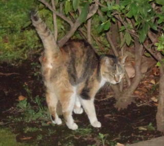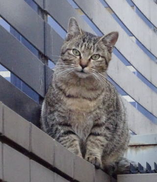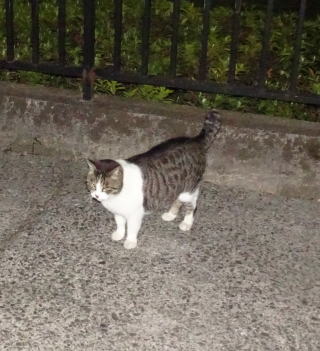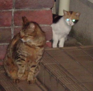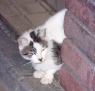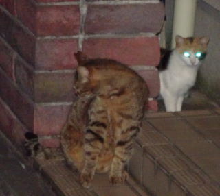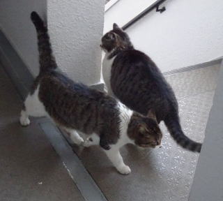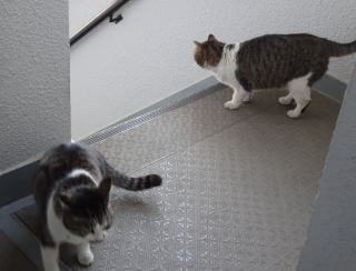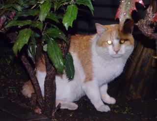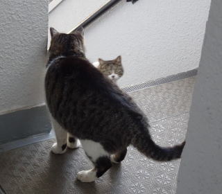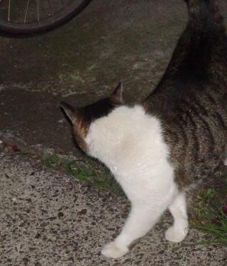 14.自分の取り合いで髪の毛を引っ張り合う雌猫達に恐怖したのか茶白の雄猫は垣根に隠れました。ヘタレなのでしょうか?。