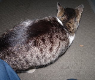 34.パパの足にマーキングする鼻キズ子のニケちゃん。「女のケンカ(Cat Fight)」の結果で顔にキズがあってもネコちゃんなら可愛いのです。