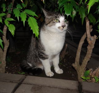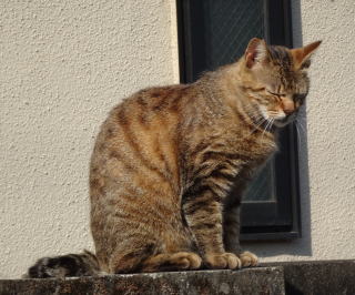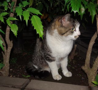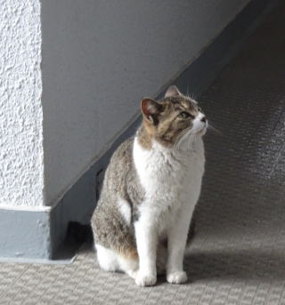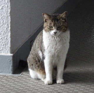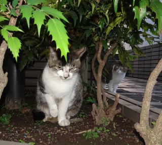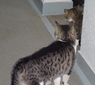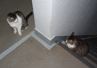 28.茶白の雄猫とデートしていない時の鼻キズ子のニケちゃんは姉妹のヴィクトリアちゃんと一緒に門番をしています。