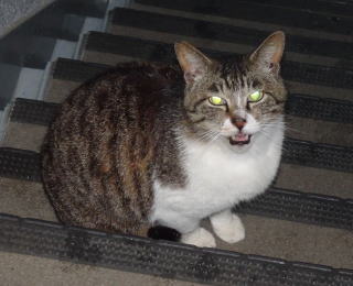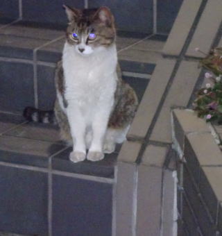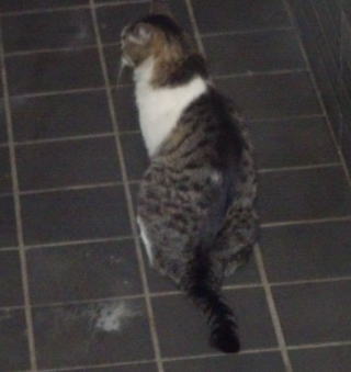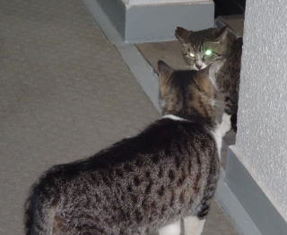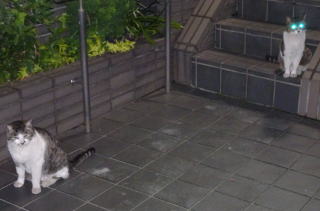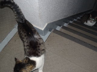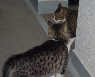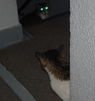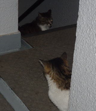 25.門番をしている鼻キズ子のニケちゃんは雌猫の侵入に気付いた様です。ヘビに睨まれたカエルの様に侵入して来たクリスティーヌちゃんは動けなくなりました。
