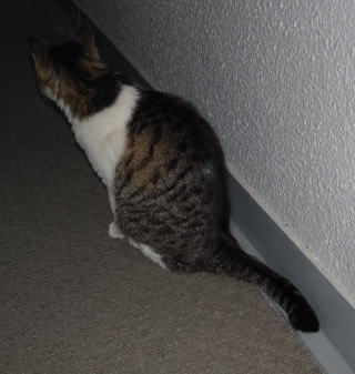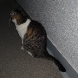 8.侵入して来たクリスティーヌちゃんも壁の陰に鼻キズ子のニケちゃんが隠れている事に気付きました。