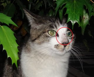 上記のアップ。数日後に鼻のキズはカサブタに覆われていました。そのうち毛でわからなくなるでしょう。