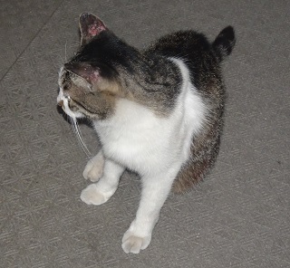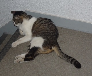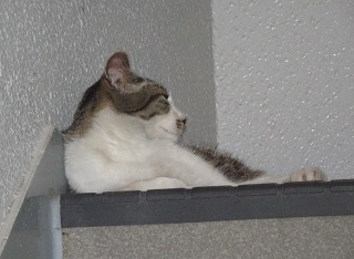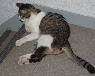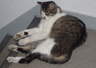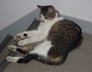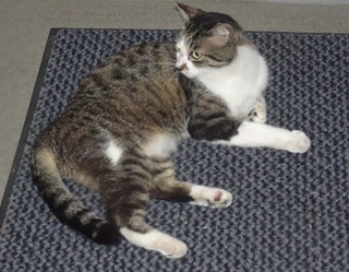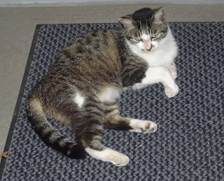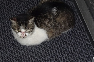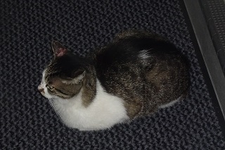 7.パパの自宅の玄関マットで公箱座りをする鼻キズ子のニケちゃん。