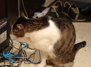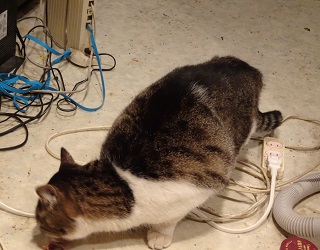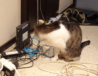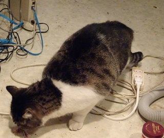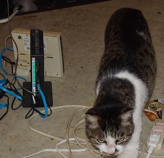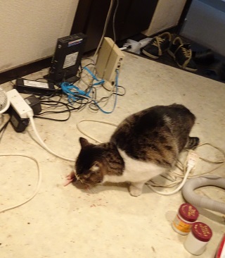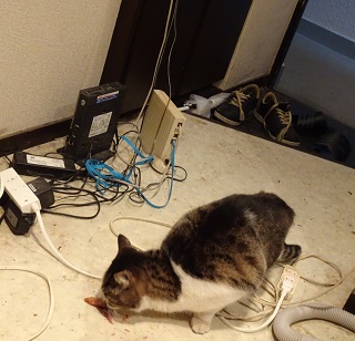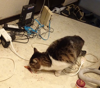 23.給料の焼き鰹を食べています。パパの玄関は配線だらけですね。傘立てがあるのに傘が投げ捨てられているし空のオロナインH軟膏まであります。