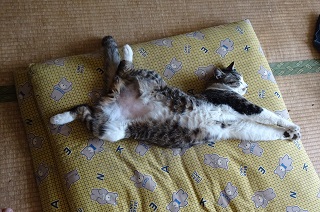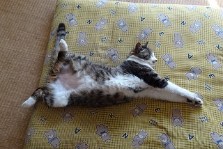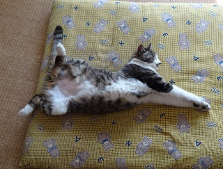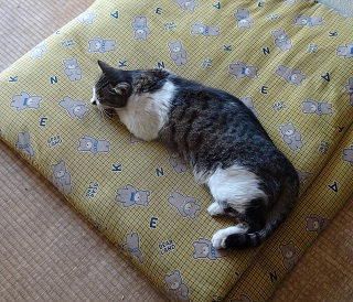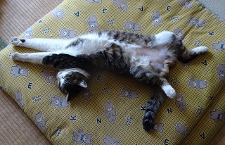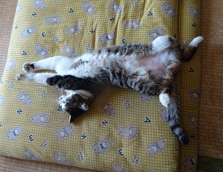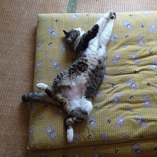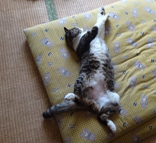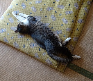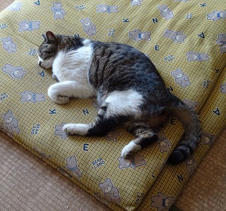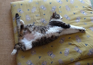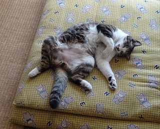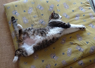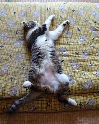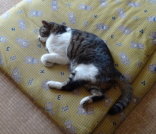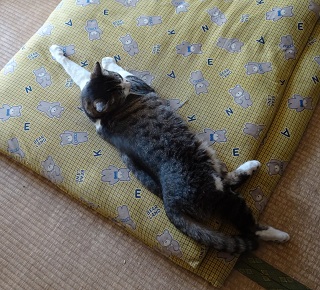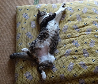 41.鼻キズ子のニケちゃんが手足を伸ばしてお腹を出すのはこの布団の上だけです。