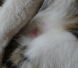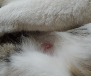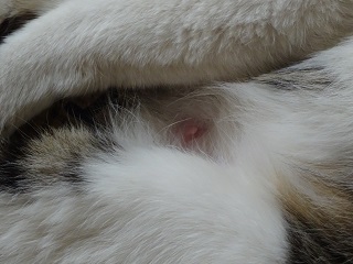 7.鼻キズ子のニケちゃんが寝ている間に身体検査です。まだ乳房が張ってなく授乳する様な状態ではありません。