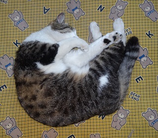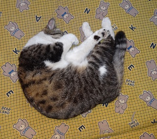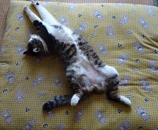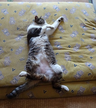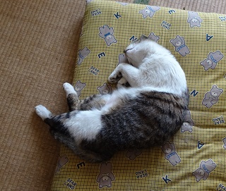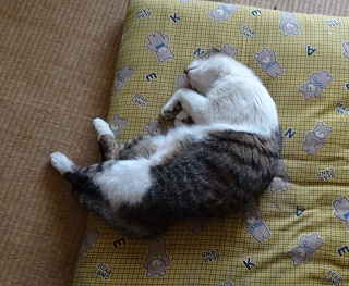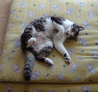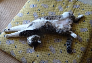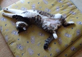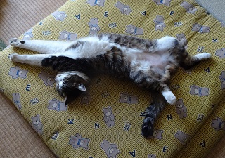 1.鼻キズ子のニケちゃんが布団の上で猫団子になって寝ている時にアゴを上に向け手足を伸び伸びさせるとこんな態勢になります。