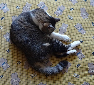 19.鼻キズ子のニケちゃんは横を向いて手足を伸ばす事もあるんだ。
