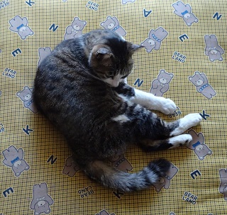 11.鼻キズ子のニケちゃんが手足を伸ばしてお腹を出しています。布団との比較です。手足を伸ばすと80~90cmある様に感じます。