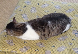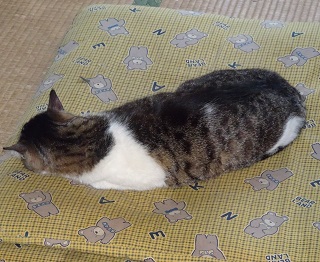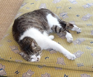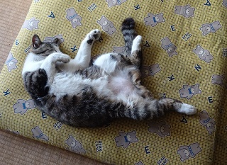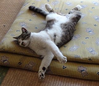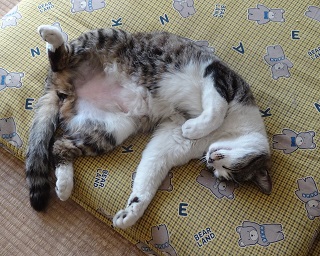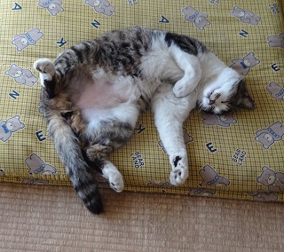 14.暑い時や手を伸び伸びさせたい時は仰向けになって腹を出して寝ます。