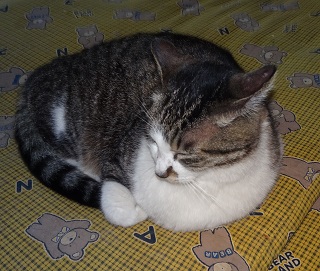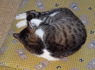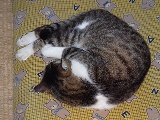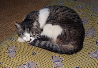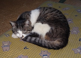 13.鼻キズ子のニケちゃんは普段ネコ団子になって寝ますが…。