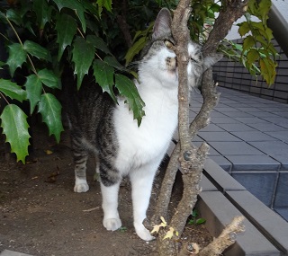 9.鼻キズ子のニケちゃんは鼻がかゆいのでしょう。木の枝に鼻をこすりつけています。