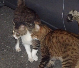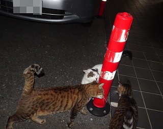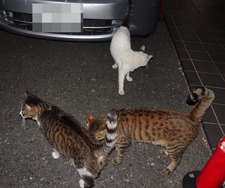 18.クリスティーヌちゃん・杏子(あんず)ちゃん・小姫ちゃんが群れています。多勢に無勢で鼻キズ子のニケちゃんから身を護っています。