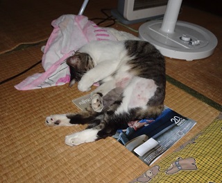 12.鼻キズ子のニケちゃんは富士通のエアコンのカタログの上で寝ています。