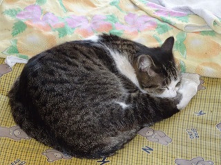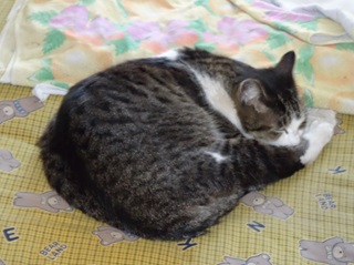 17.自分の布団の上で安眠する鼻キズ子のニケちゃん。夏場は手足を伸ばし腹をだして寝ます。しかし冬場は猫団子になって寝ます。