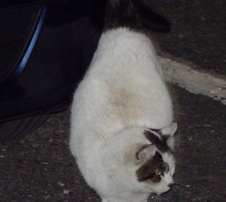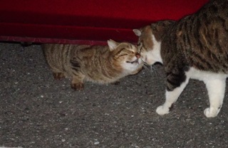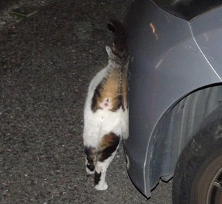 27.大柄な鼻キズ子のニケちゃんはこうやってパパのお出迎えをします。しかし小柄な杏子(あんず)ちゃんは塀の上や自動車の下が精一杯なのでしょう。
