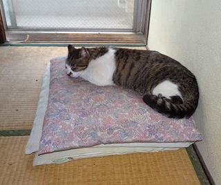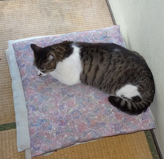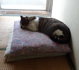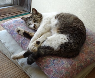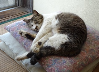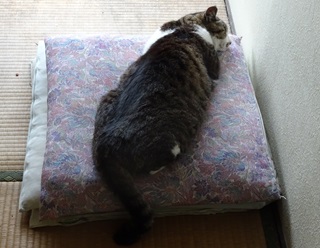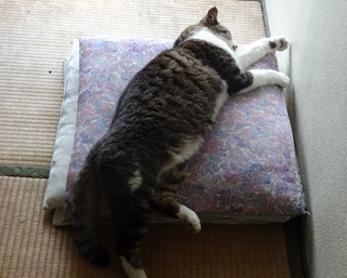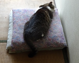 5.大柄な鼻キズ子のニケちゃんが座布団の上でネコ団子になると手足がはみ出るのですね。