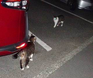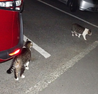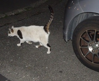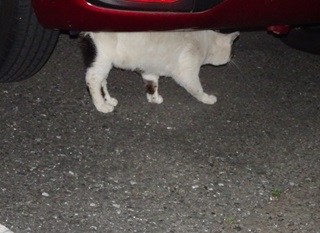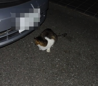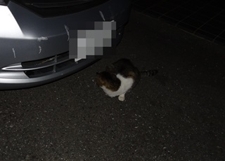 36.鼻キズ子のニケちゃんは自動車の下に隠れている雌猫を覗き込んでいます。
