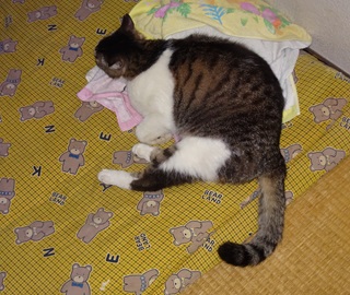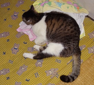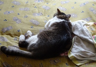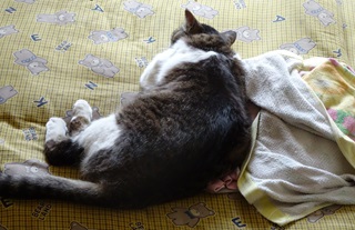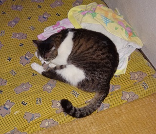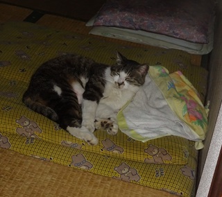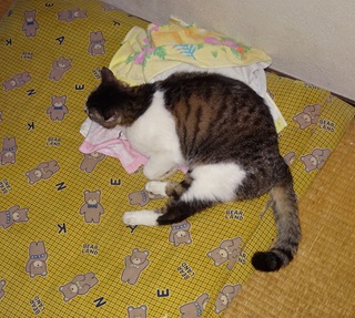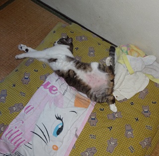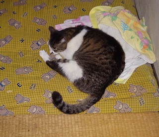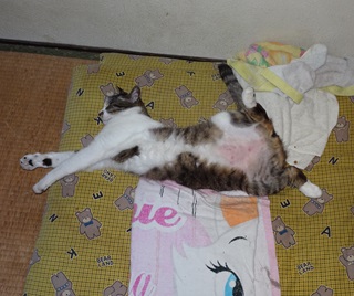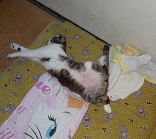 34.布団の上で足を伸ばす鼻キズ子のニケちゃん。