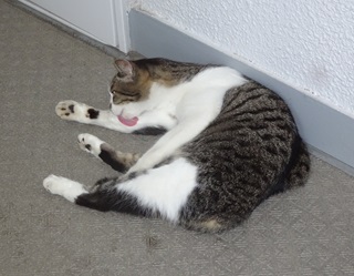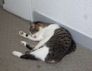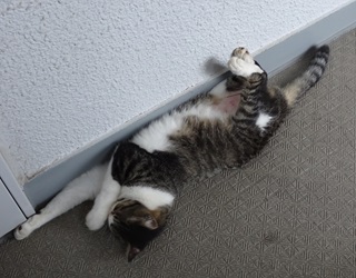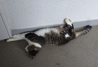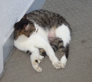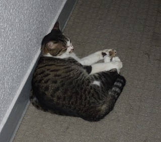 44.鼻キズ子のニケちゃんは部屋の外でも内でもその寝相なのですね。