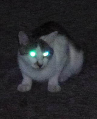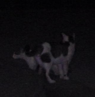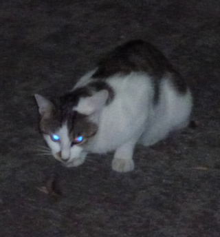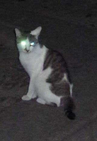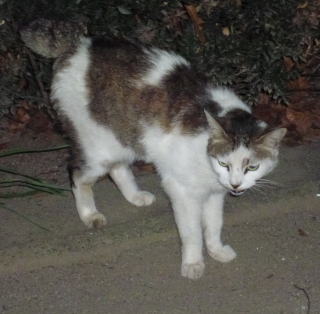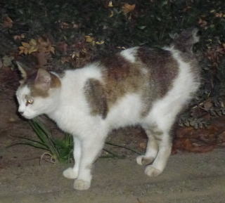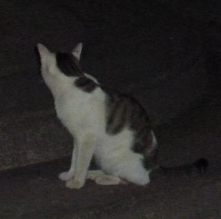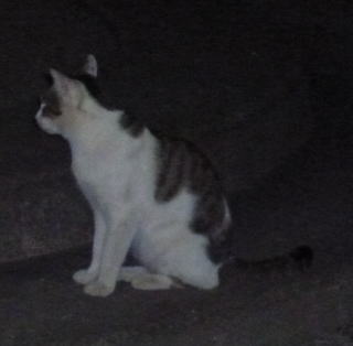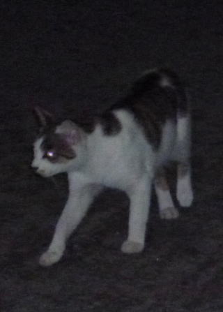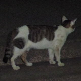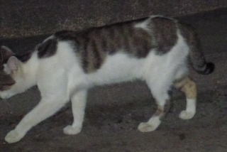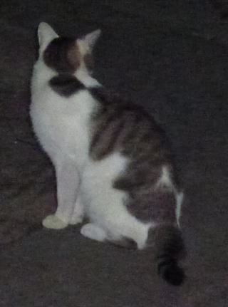 フミちゃんと四匹の子猫が勢揃いしていたのに割って乱入してきたのはユマちゃんの母親。背中や後足の毛柄がユマちゃんと一緒。猫は黒毛や茶毛より白い毛の遺伝子が一番強い為、混血する毎に白毛が多くなってくる。ユマちゃんが不自然に白毛が多くなった為、毛柄が綺麗じゃないけど母親のユナちゃんは自然なサバ虎白で娘より美人です。