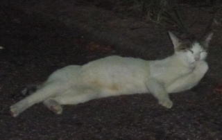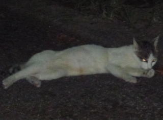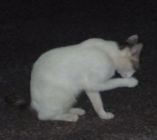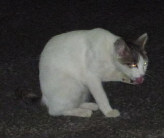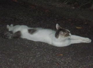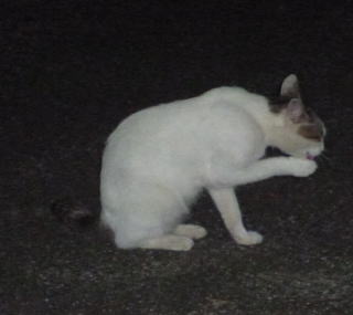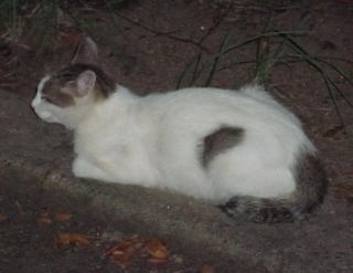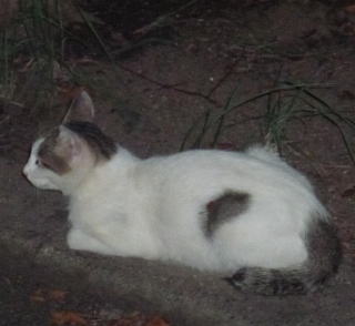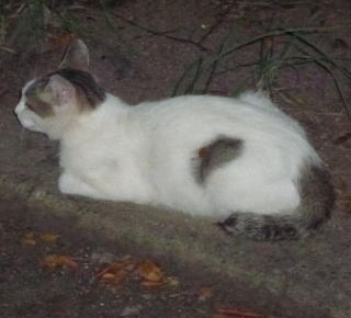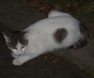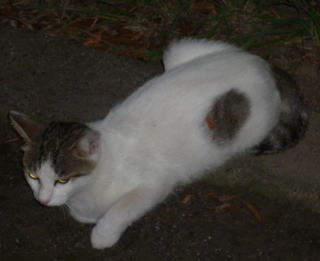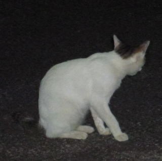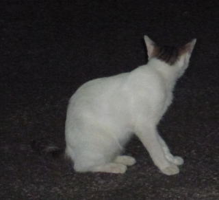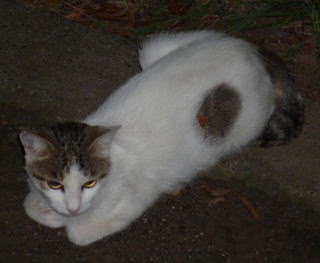 43.リボンちゃんの娘のカリンちゃんも頭部、左背、尾のみサバ虎柄の白猫で共通している。